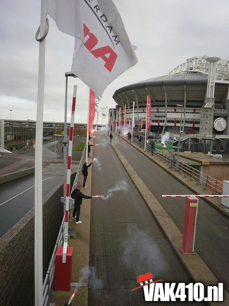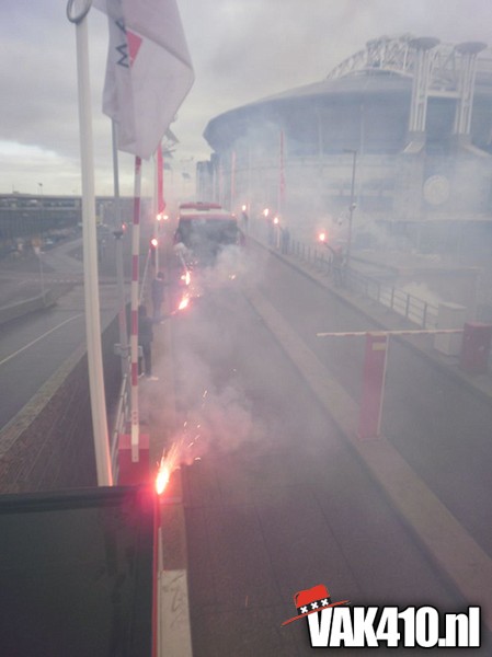 In Amsterdam word er van alles aan gedaan om supporters van Ajax en Den Haag weer de onderlinge wedstrijden te laten bezoeken. Den Haag is dan ook gewoon welkom in de Arena, maar in de hofstad vinden ze het kennelijk allemaal wel prima zo. En daar kunnen wij niet bij met ons hoofd! Uitsupporters voegen aan een wedstrijd beleving toe. Een beetje onderlinge rivaliteit maakt de spanning nog een stuk groter! Wij willen niets liever dan eindelijk weer eens naar Ado te mogen reizen! Vanmorgen werd door VAK410 met een groep van 50 verzameld bij de fly-over van de Arena. Bij het passeren van de spelersbus werd er vuurwerk ontstoken en de spelers werden toegezongen. De enige manier om hen vandaag te supporten. Maar alleen dit jaar nog op deze manier, want voor volgend seizoen zullen wij er voor zorgen dat we hoe dan ook in Den Haag staan! Daarvoor zullen we echt alles uit de kast trekken! Geef ons ADO uit terug! Na het ondersteunen van de spelers werd er koers gezet richting de stad, waar we in de kroeg zagen dat Ajax met liefst 4-0 won.