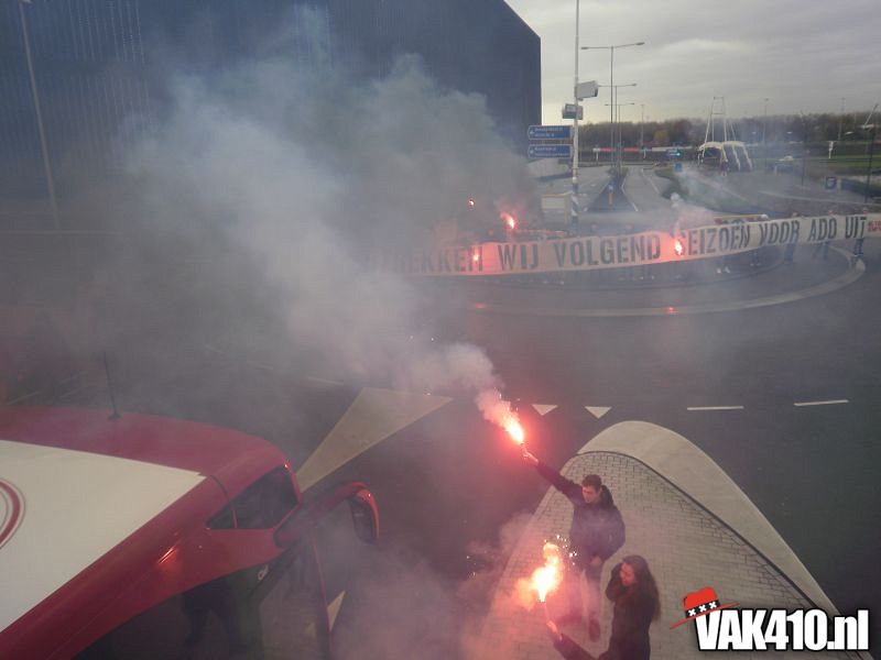 Zondagochtend rond een uur of 10. De spelersbus van Ajax vertrekt naar Den Haag, de aftrap is om half één. Voor het zevende jaar op rij mogen er bij deze wedstrijd geen Ajaxsupporters aanwezig zijn. Bij Noord B is het dan ook leeg. Normaal gesproken waren er op deze ochtend honderden supporters vertrokken voor een combi naar ADO. De termijn van 5 jaar geen onderlinge supporters is voorbij. Wij willen weer naar Den Haag!