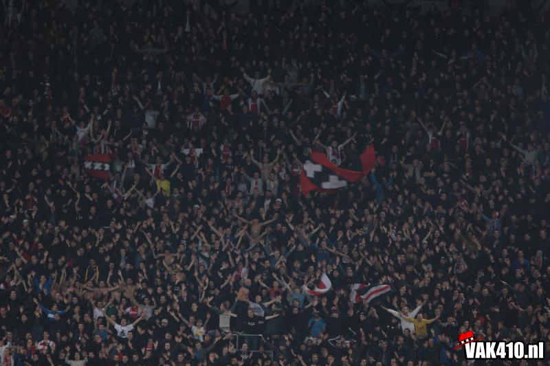 We beginnen kwa sfeer goed. ‘Geen dag’ start keihard en vervolgens zitten er ook diverse uitschieters tussen. Later zakt het wat in, mede misschien ook doordat het op veld nog niet echt lukt. Vlak voor rust is het toch raak. De tweede helft knalt het vak dan ook nog harder, wetende dat Ajax met deze steun de voorsprong nog verder kan uitbouwen. En dat gebeurd. Met uitstekend voetbal is de stand na zo’n 50 minuten spelen 3-0 en barst er een massaal feest los. Diverse songs galmen door de Arena en na de 4-0 gaat het volume alleen maar verder omhoog tot het einde van de wedstrijd.