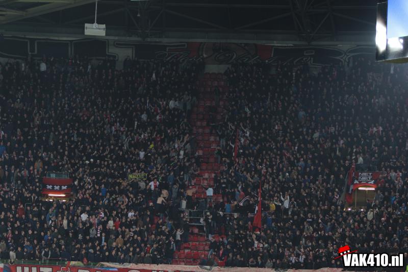 Op het vak vindt een ieder een Amsterdams doekje op zijn stoel. Weken lang werd er door diverse jongens voorbereid en gebouwd aan 1600 Amsterdamse vlaggen. Na diverse songs, die meteen goed hard gaan , betreden de spelers het veld voor de wedstrijd. Het gehele vak wordt volledig gekleurd door de Amsterdamse doeken en megavlaggen wat zorgt voor een fantastisch gezicht.