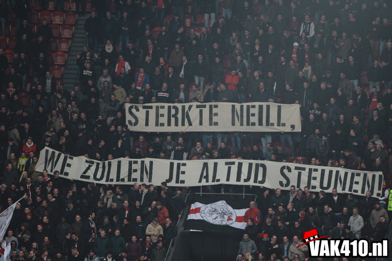 Uiterraad slaat dit over op de tribunes. Na elke kans of aanval wordt het volume van de support harder, ziet ook onze gast Hedwiges Maduro. Nadat twente terugkomt tot 2-2 is daar de 3-2 na zo'n 70 minuten. Vanaf het vak klinkt vervolgens massaal 'Dale'. Als 5 minuten later de 4-2 erin ligt is het vak niet meer te houden. Met onder meer '90 minuten lang' trilt het beton. Ook de vakken naast 410 springen mee. Ajax sleept onder leiding van spelers uit eigen jeugd de overwinning binnen en we kunnen dan ook terugkijken op een mooie avond.