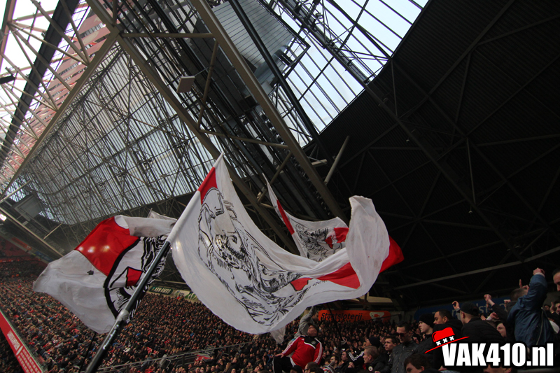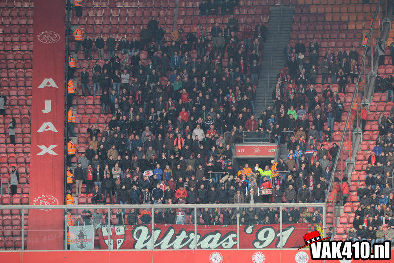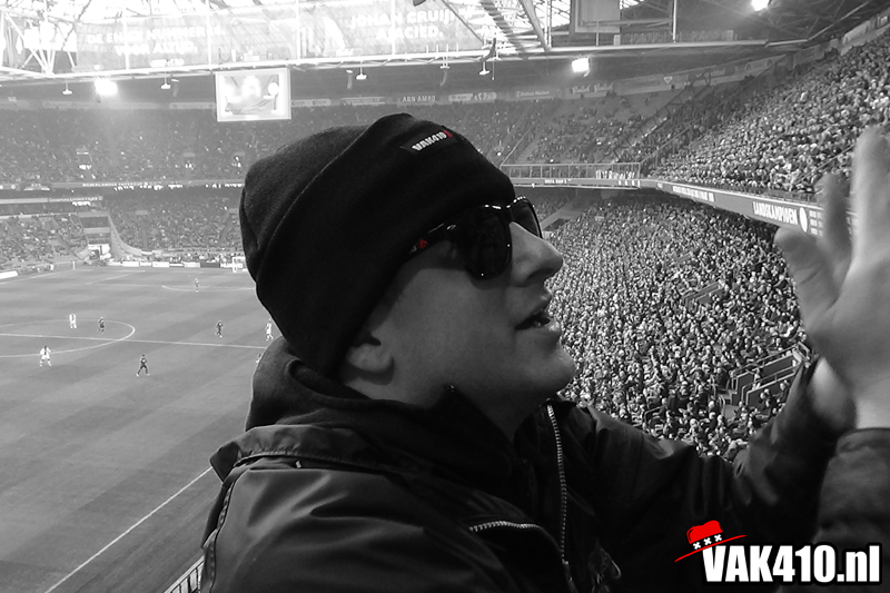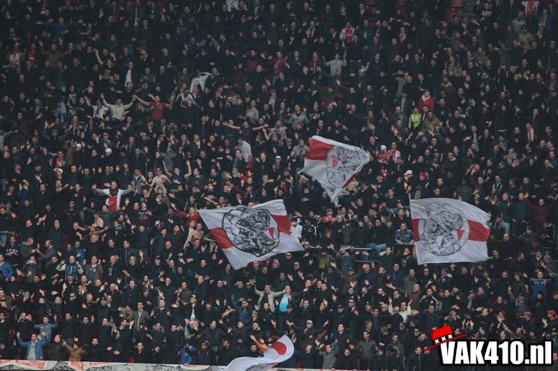Zodra het metershoge doek naar beneden gaat is het tijd voor chaos. De lijn die is ingezet met AZ thuis kent vandaag zijn vervolg. Opnieuw staan er jongens bij 424 en wordt er 90 minuten lang gevlagd. De sfeer is uitstekend, diverse keren gaat een song goed hard. Ook op het veld gaat het goed. In tegenstelling tot afgelopen weken waar het moeizaam ging en soms met wat gelukt, knokt Ajax zich vandaag terug na een achterstand.