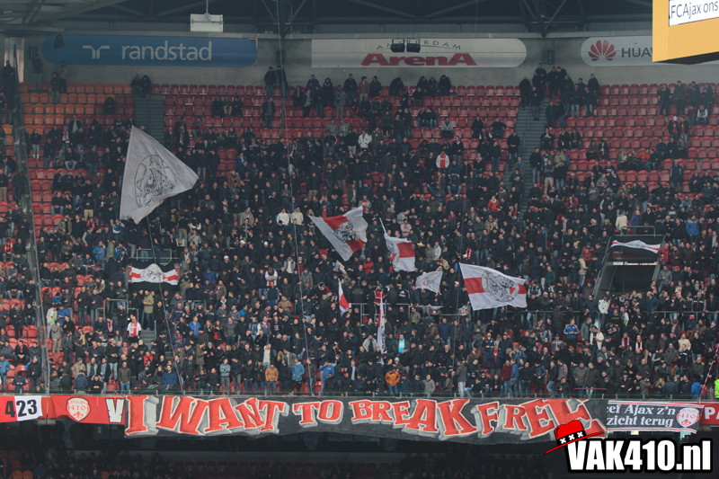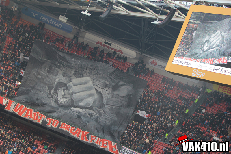 In het kader van de actie 'Geef Ajax z'n gezicht terug' stond er een grote Tifo actie op de planning. Wij zullen net zolang blijven strijden voor het oude logo totdat deze terug is. Hierdoor werd er dan ook wederom door diverse jongens een hoop werk verricht in de weken voor deze wedstrijd. Vandaag is het resultaat daar. Bij opkomst van de spelers wordt er een gigantisch hijsdoek omhoog getrokken met daarop onze Griekse held, die met zijn vuist door een muur heen slaat. De tekst op het balustrade doek, die ook uit de speakers klinkt, maakt de boodschap duidelijk ; I WANT TO BREAK FREE !