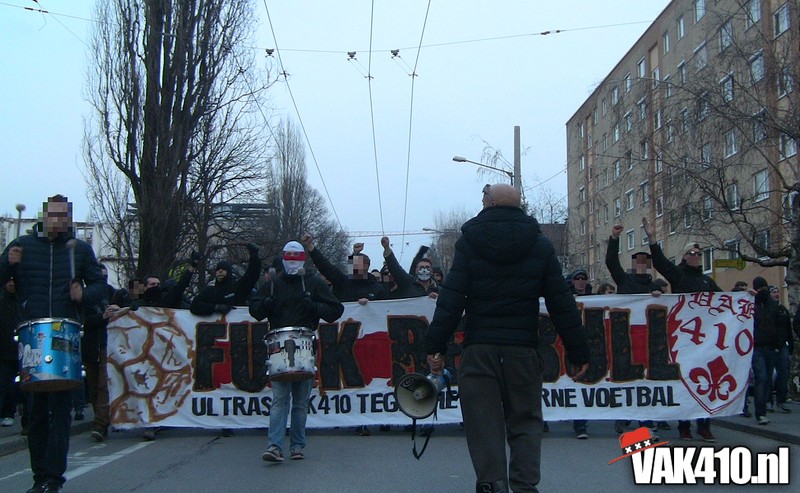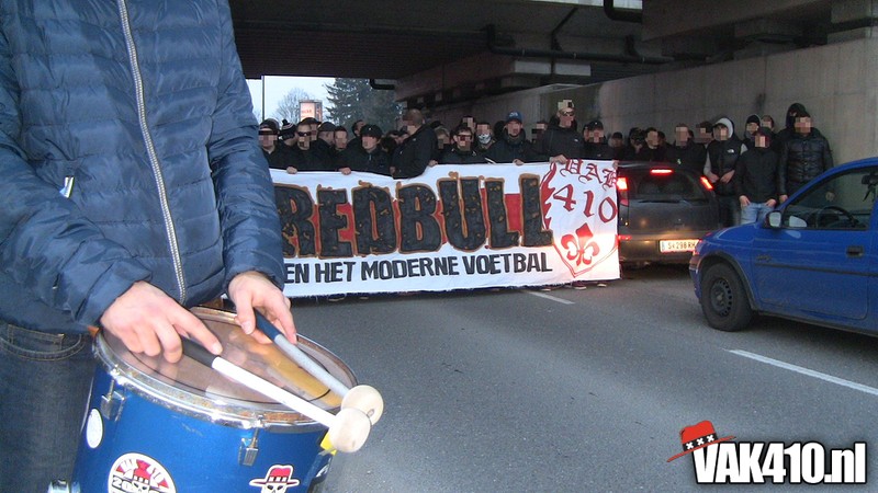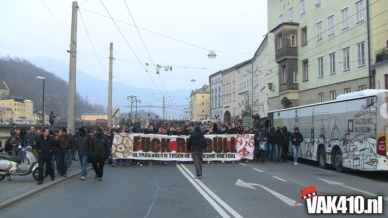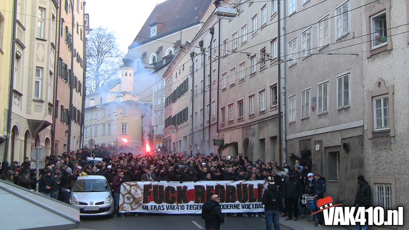 De volgende dag werd er op dezelfde plekken verzameld en rond 17.00 werd er koers gezet richting het stadion, per corteo wel te verstaan. Als groepsdoek een duidelijke boodschap: FUCK RED BULL, Ultras VAK410 tegen het moderne voetbal. De plaatselijke bevolking stond wel even te kijken van de grote groep Ajacieden die al zingend door de straten van Salzburg trokken. Enkele mooie momenten onderweg, met onder andere chaotische taferelen in een tunnel.