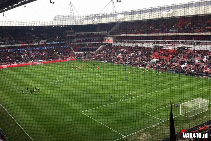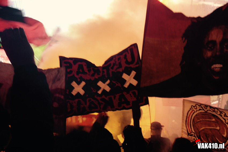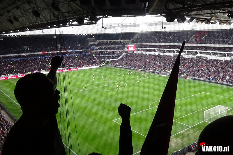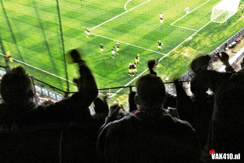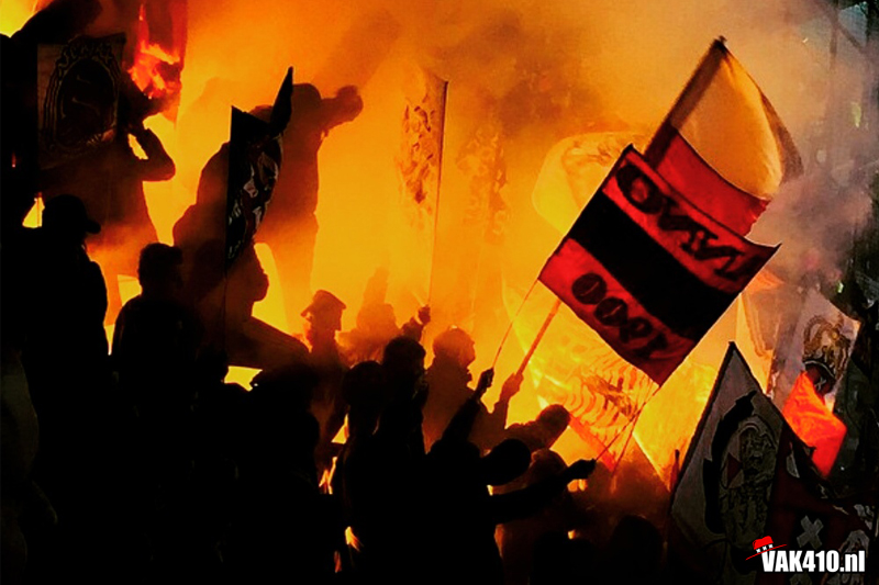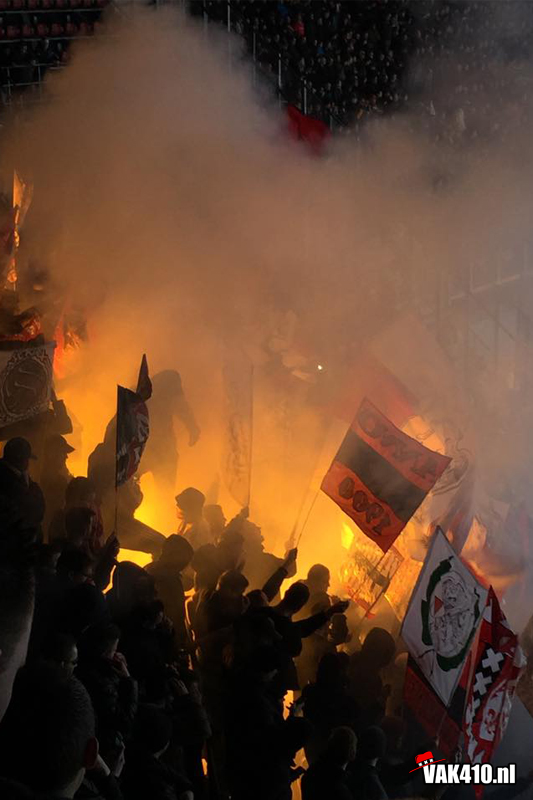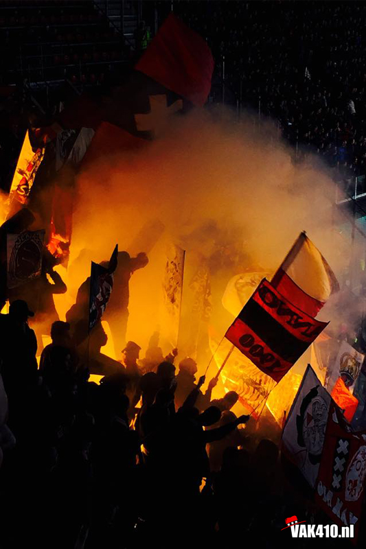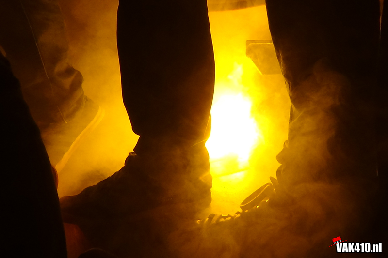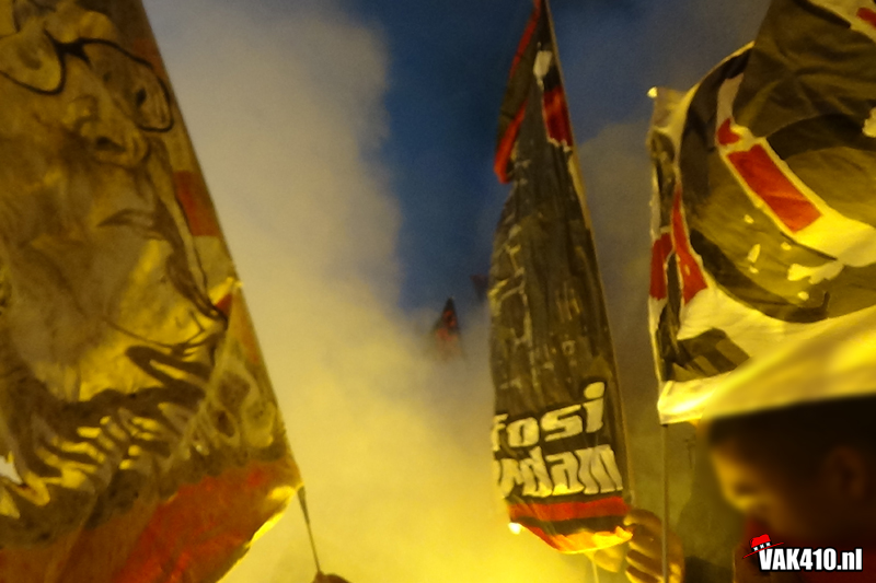Een grote groep van VAK410 neemt vandaag wel plaats in het uitvak. Nadat diverse liederen zijn gezongen tijdens de warming up maken we ons klaar voor het begin van de wedstrijd. Bij opkomst van de spelers pakken we uit met een hoop bandieri's en vlaggen. De chaos wordt compleet met het nodige vuurwerk. Legalize pyro !