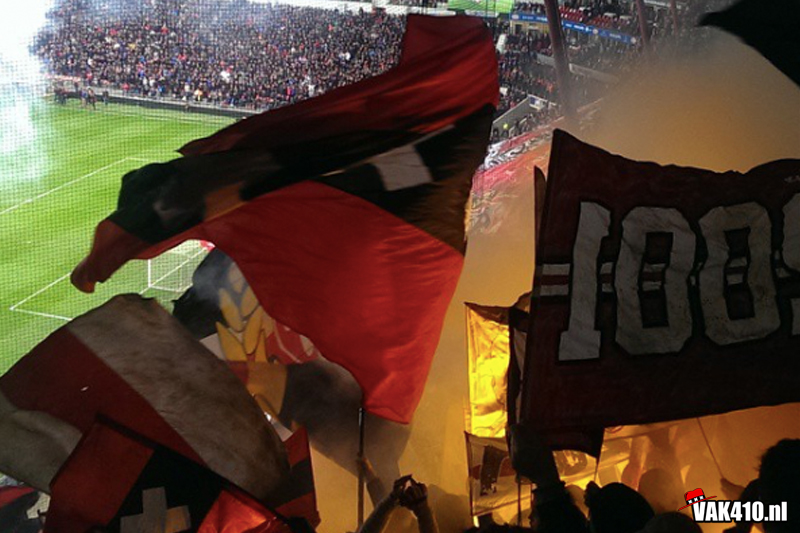 Zodra de rook is opgestegen galmen de songs vanuit het uitvak door het stadion. Gedurende heel de wedstrijd zijn we, ook op tv, luidkeels te horen. Af en toe is er een mooie battle op vocaal gebied met de PSV aanhang, maar over het algemeen zijn we op dit front vandaag de baas. Het volume ligt non-stop hoog en diverse songs zorgen voor een wild uitvak.