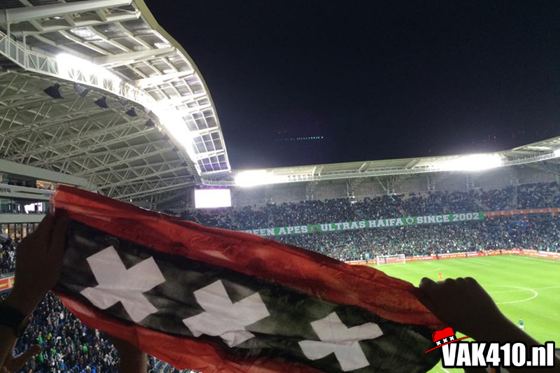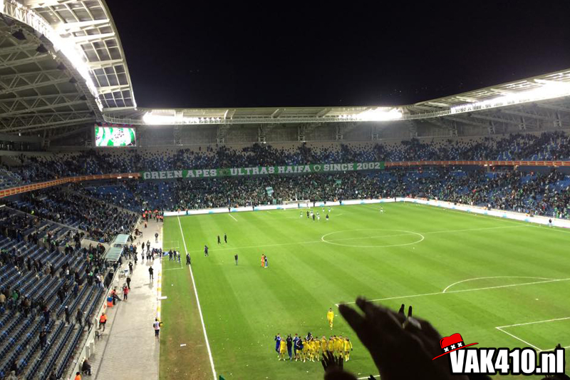 Maccabi Haifa heeft sinds kort een mooi nieuw stadion met tribunes die dicht op het veld zitten. Het uitvak is gevuld met zo'n 2500 man. Haifa opent met een choreo actie en in het uitvak is er dit maal geen tifo actie te zien. Het thuispubliek laat zich goed horen evenals het uitvak, met sommige melodieën kan je wel meedoen maar verder is er aan de taal geen touw aan vast te knopen. De melodieën daarin tegen zijn wel een genot om naar te luisteren. De Amsterdamse vlag laten we verschillende keren zien en Ajax joden super joden klinkt ook even.