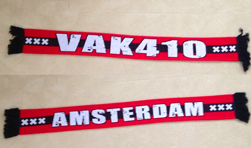 Aanstaande woensdag is vooraf de wedstrijd AFC Ajax - Manchester City de nieuwe VAK410 sjaal verkrijgbaar bij het 410 Merchandisehok! De kosten voor de sjaal bedragen slechts Eur. 12,50. Het merchandisehok is te vinden naast de ingang van 424 en is open vanaf stadionopening tot een kwartier voor de aftrap.