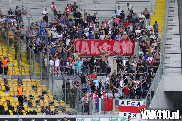 In de 14e minuut was er een kleine wit-rood-witte rookshow. Met veel gefluit van de thuisaanhang op deze actie en enkele rookpotten op het gras, was de toon gezet. Wij allen kennen ook de vocale steun van Dynamo. Op enkele hele harde momenten van DY-NA-MO en massale handclaps na was de sfeer niet zo goed. Voor en tijdens de match werden enkele Ajacieden uit de groep gehaald. Op het vak werd de bestorming van de politie die enkele van ons er uit pakte, niet gewaardeerd door ons. Na de 0-3 en het incident met het oppakken van onze jongens werden we nog een uur vastgehouden bij onze bussen. Enkele stenen werden over een heg gegooid waarop enkele arrestaties volgde. telefonisch werd er gemeld dat wij 5 minuten nadat we met de bussen zouden vetrekken nog wat konden verwachten. We wachten nu nog in spanning af op het grote Dynamo?! Wellicht was voor vele van hun de zomerstop belangrijker dan dat een grote club als Ajax op bezoek komt.