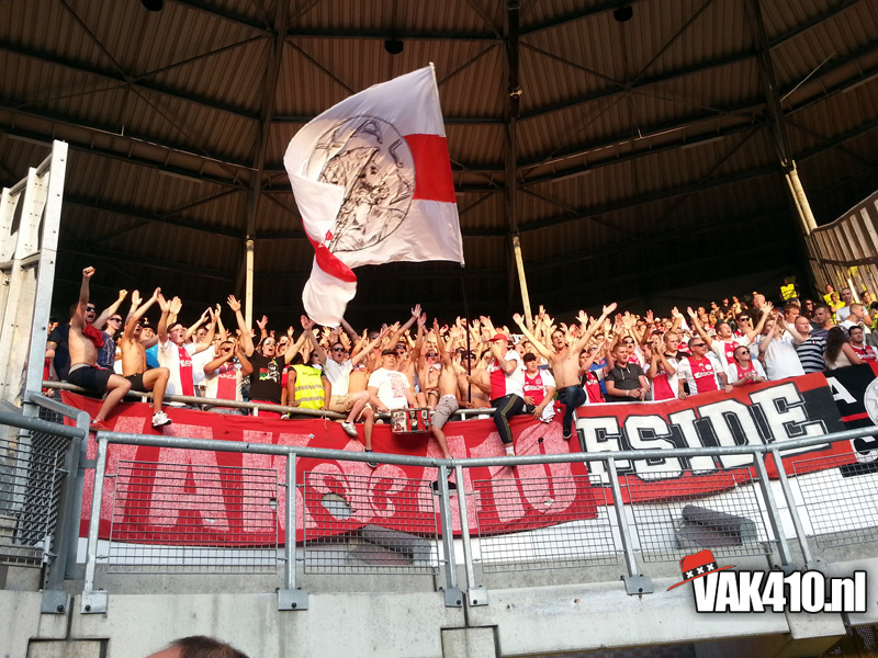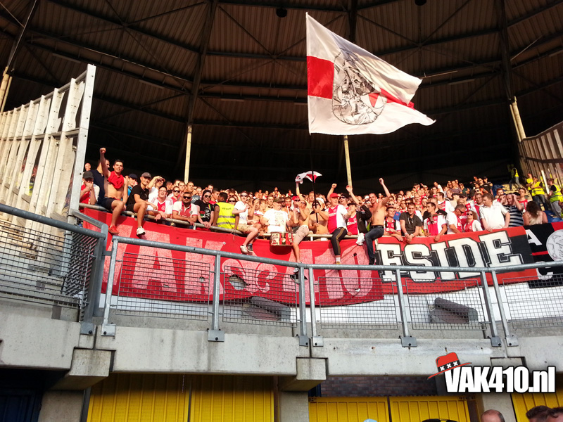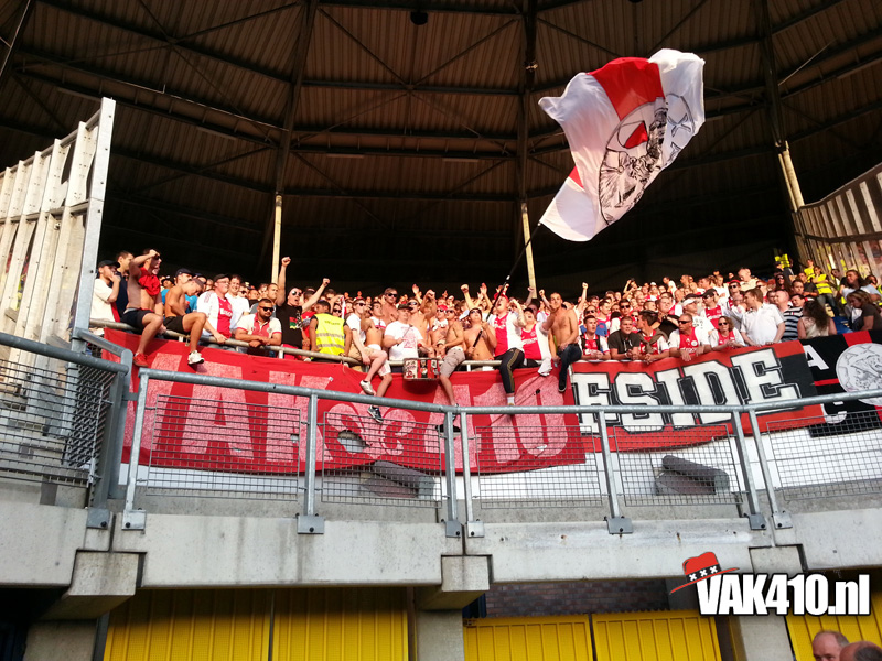 Onze bus komt als eerste aan bij het stadion van de blauw-witten. Bij aankomst blijkt maar weer eens hoe onnodig moeilijk het supporters iedere keer weer gemaakt word. In het voor overleg is er aan Ajax aangegeven dat het is toegestaan om 50bandieri’s mee te nemen, één drum, en geen GROTE spandoeken. Een groot spandoek, tja wat moet je daar anders van maken dan zo één die we zo nu en dan over de tribune laten gaan…? Echter, bij Heerenveen noemen ze het VAK410 uitdoek een groot spandoek, deze mag niet mee naar binnen. Een gesprek over de velen portofoons en oortjes volgt, duurt lang en duurt maar. Dan komt ook de F-side binnen, zij mogen zich bij ons voegen en ook de gesprekken afwachten. Wanneer ons doek niet naar binnen mag, gaan wij ook niet naar binnen, onze identiteit pak je niet van ons af! Eindelijk positief bericht volgens een medewerker van Heerenveen, die ene mag mee naar binnen, maar die ander niet! Een keuze die beide groepen uiteraard niet kunnen accepteren! Na lang onderhandelen en veel onnodig geouwehoer, kunnen we eindelijk allemaal een plekje zoeken in het uitvak en de groepsdoeken ophangen.
