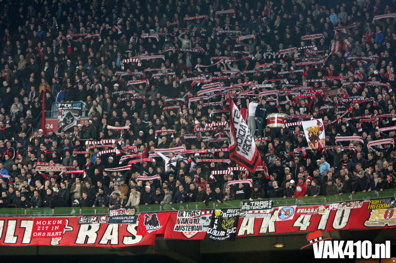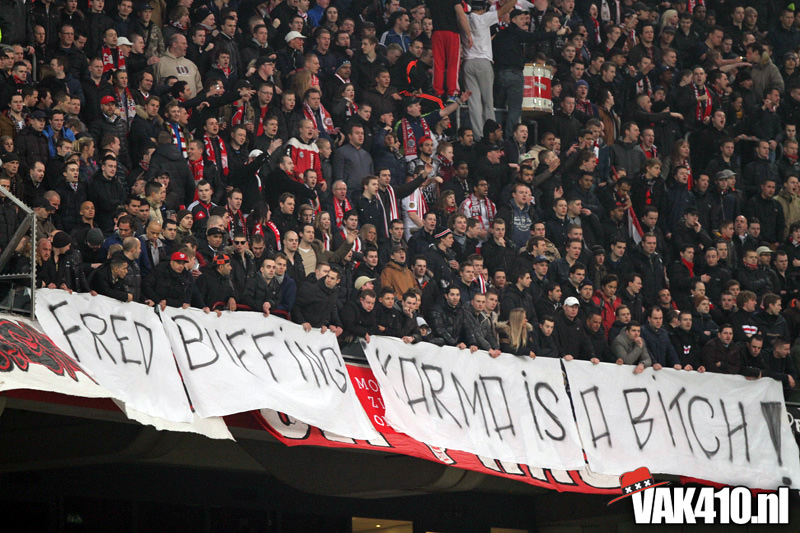 Tijdens de wedstrijd verschijnt er een spandoek met de tekst: ‘Fred Buffing, Karma is a bitch’ op het vak. Wij hebben vanuit bronnen binnen de Amsterdamse politie vernomen dat Fred Buffing, politieagent en moordenaar van Michael Koomen, een hersentumor heeft. Normaal gesproken zou je zeggen dat je dat niemand toewenst, maar in dit geval, waarin Justitie deze ontspoorde agent niet straft en continu indekt…. Karma is a bitch, of niet dan Fred?