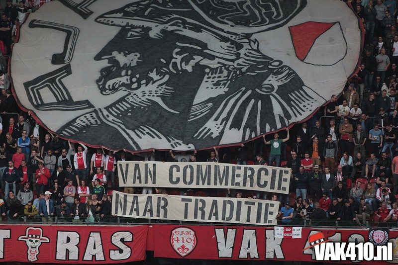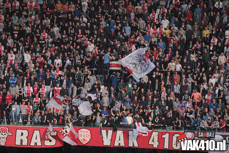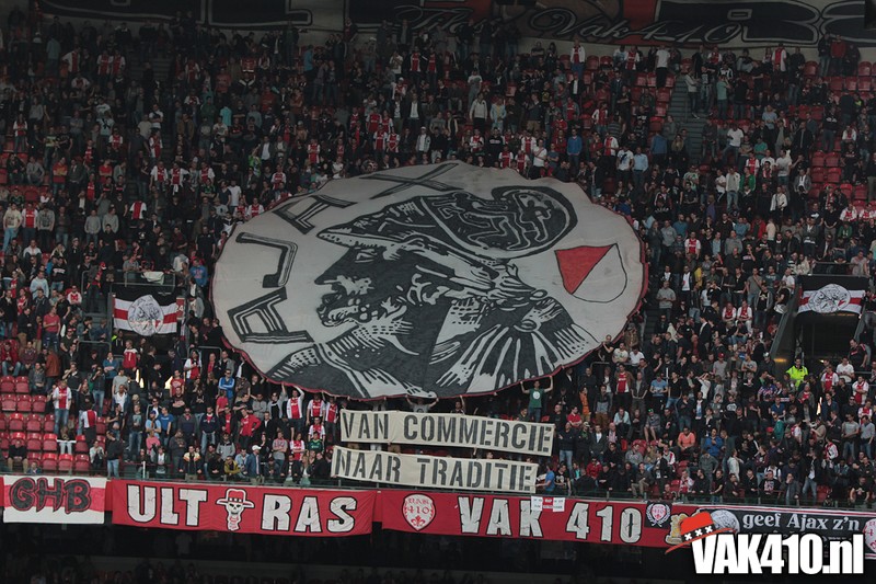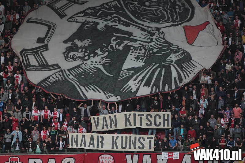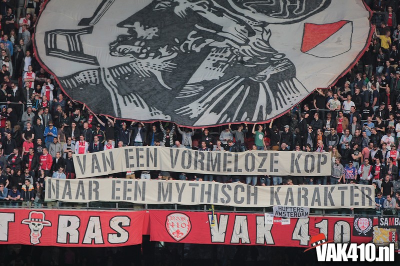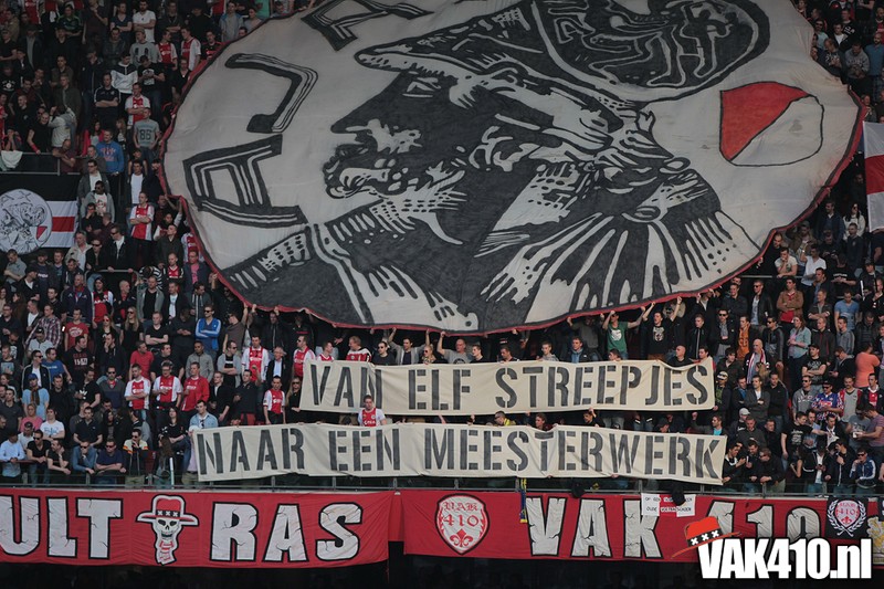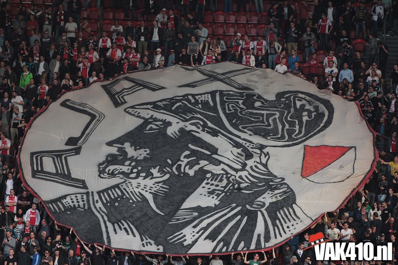 Bij de ingangen van het stadion werd er, vandaag wel succesvol, geflyerd voor de actie Geef Ajax zijn gezicht terug. Eenmaal in het stadion bleek al gauw dat nagenoeg alle Cambuur supporters de toegang was geweigerd, zonde! Ook vandaag stond het oude logo weer centraal op het vak, ditmaal door middel van een megadoek met begeleidende tekstdoeken die meerdere malen gedurende de wedstrijd werden getoond. Ajax speelde uiteindelijk teleurstellend gelijk, waaruit maar weer bleek dat de titel nog zeker niet binnen is. Aankomende zondag staat NAC uit op het programma, een lastige horde op weg naar titel nummer 33.