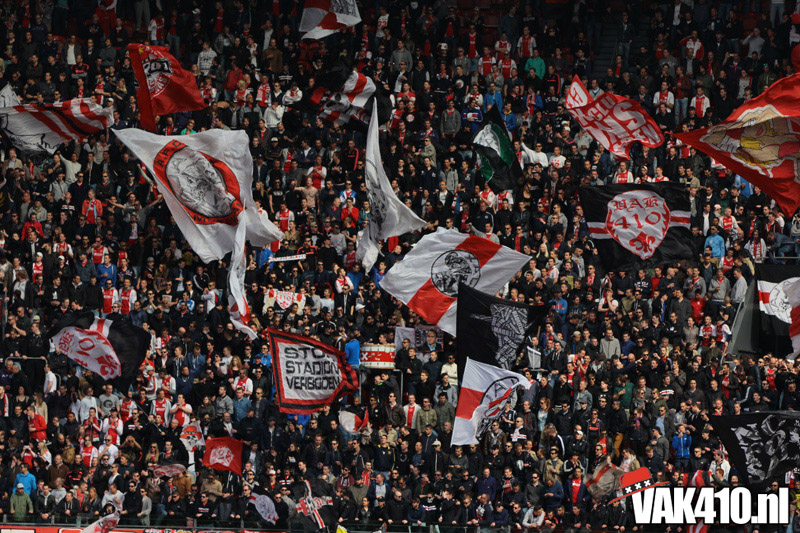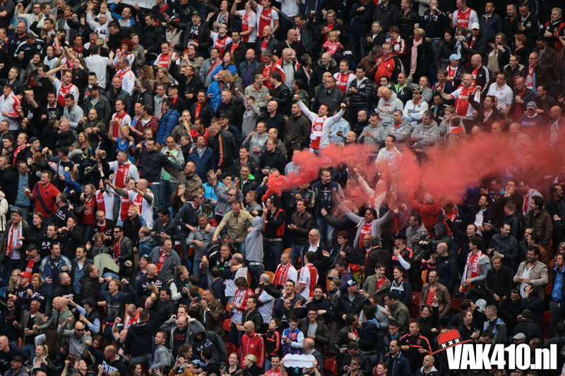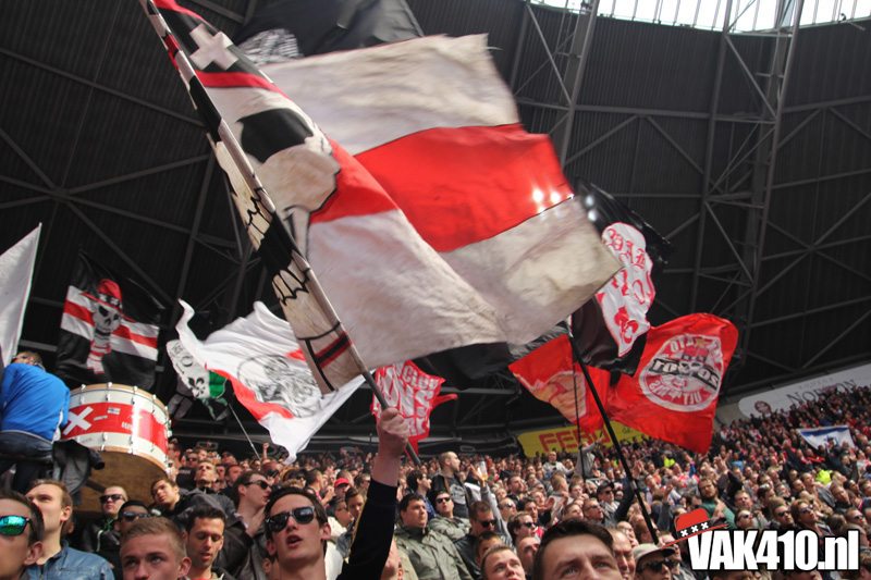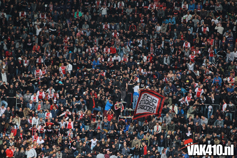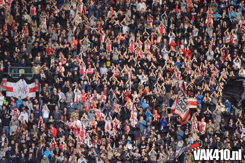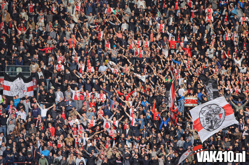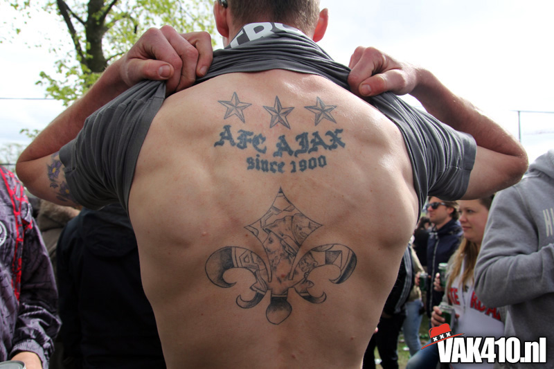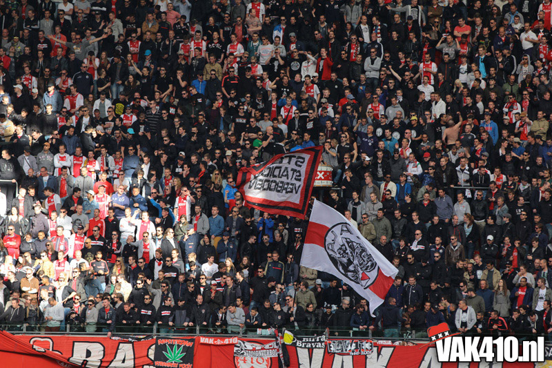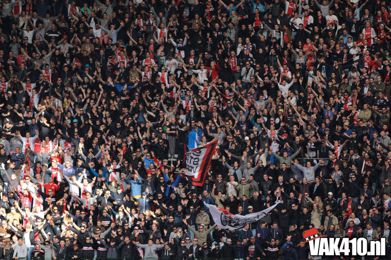 Ajax heeft het vandaag alleen niet in eigen handen. Nummer twee Feyenoord speelt uit bij PSV en moet dan niet verder komen dan een gelijkspel. Ajax speelt opnieuw geen beste partij maar wint verdiend van ADO Den Haag. In Eindhoven wordt PSV verslagen dus weten wij tijdens de wedstrijd al dat het officiƫle feestje nog twee weken wordt uitgesteld. Maakt ons niet uit, officieus kampioen is voor ons ook een reden om even goed te gaan zuipen op de Wallen.