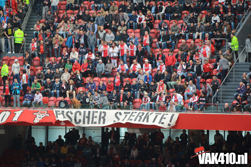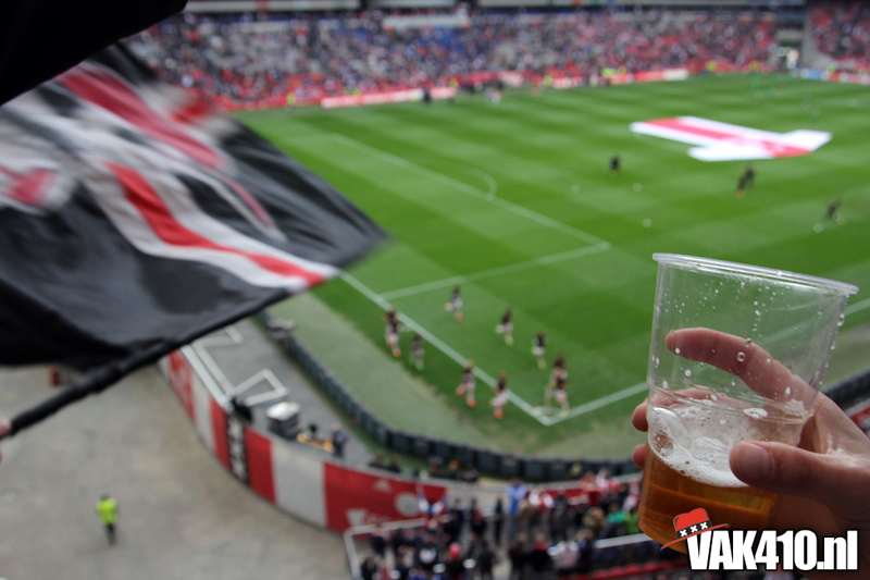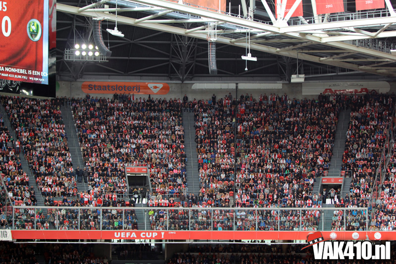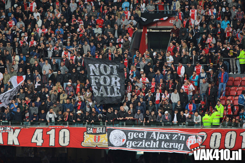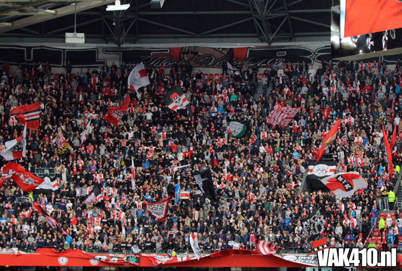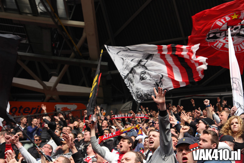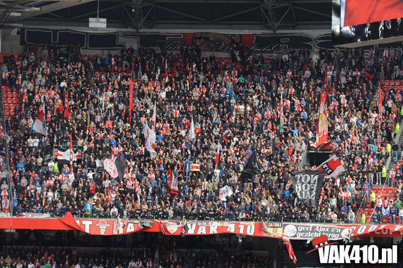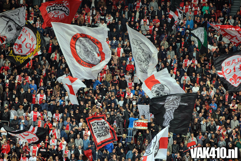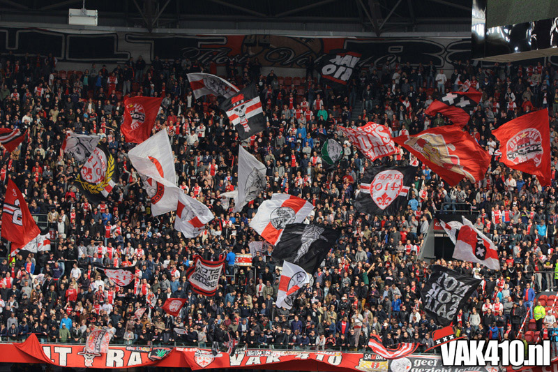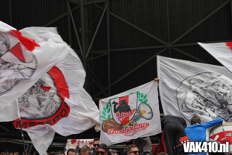Ajax heeft het vandaag alleen niet in eigen handen. Nummer twee Feyenoord speelt uit bij PSV en moet dan niet verder komen dan een gelijkspel. Ajax speelt opnieuw geen beste partij maar wint verdiend van ADO Den Haag. In Eindhoven wordt PSV verslagen dus weten wij tijdens de wedstrijd al dat het officiƫle feestje nog twee weken wordt uitgesteld. Maakt ons niet uit, officieus kampioen is voor ons ook een reden om even goed te gaan zuipen op de Wallen.